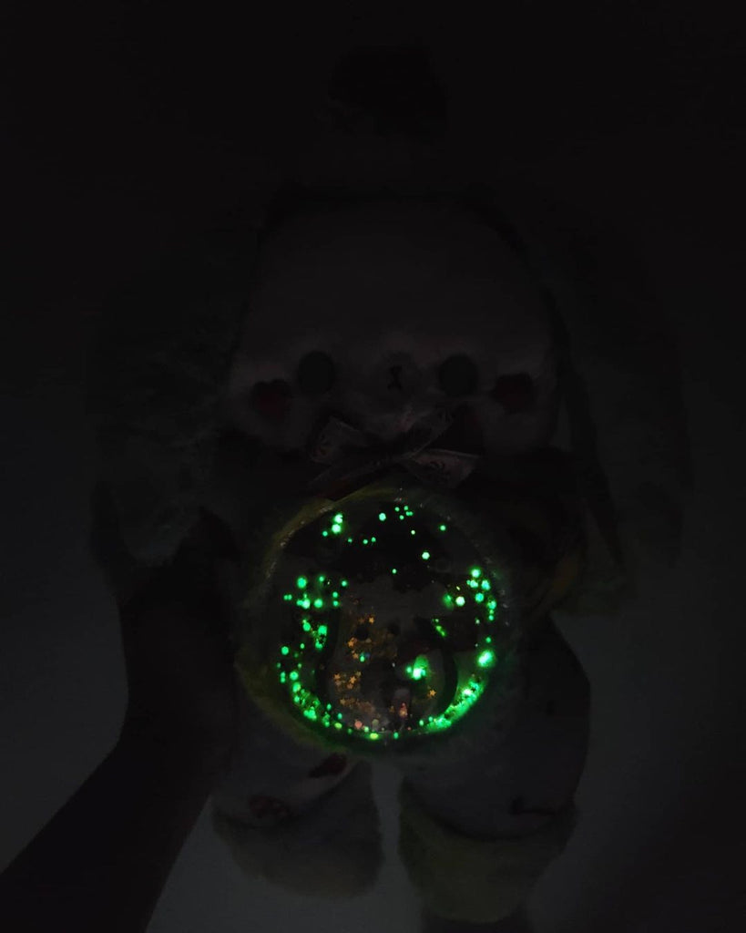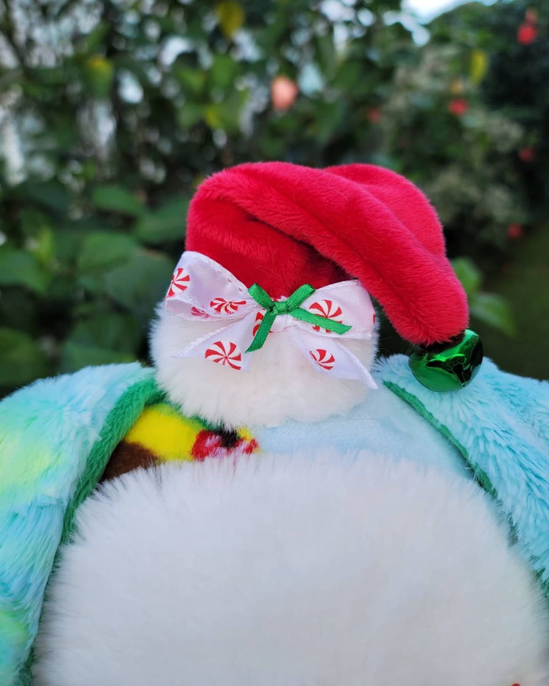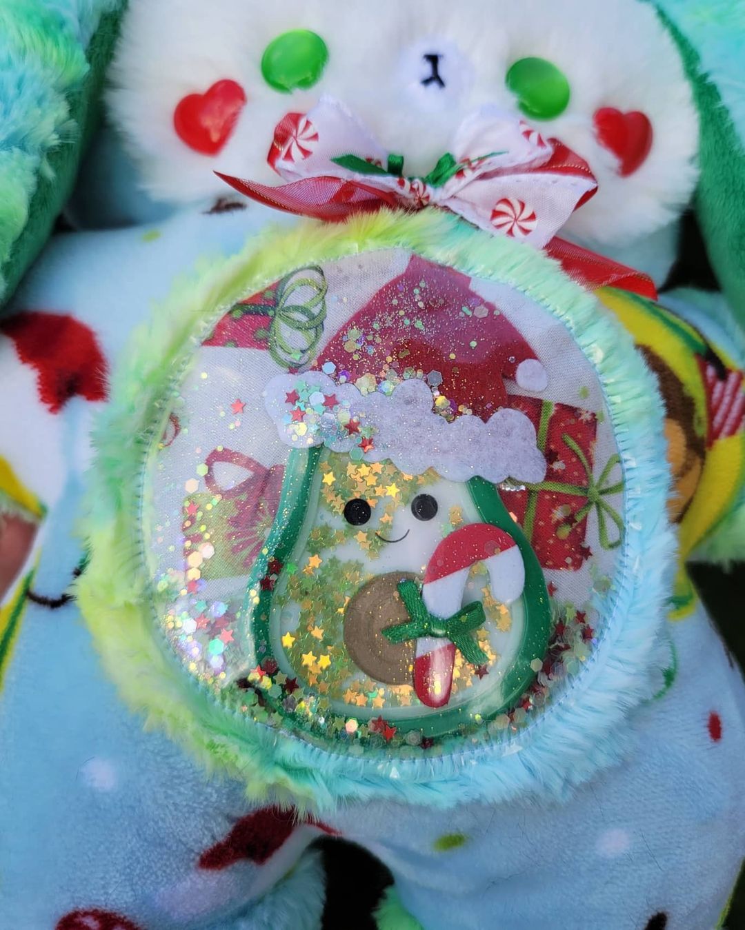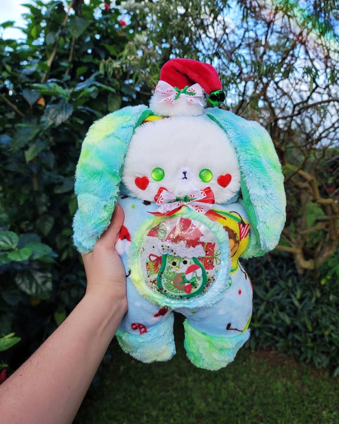 He is a Christmas avocado bunny! 🐰💚 He has a cute Christmas hat with a little bell on the end and an avocado belly with lots of sparkles!