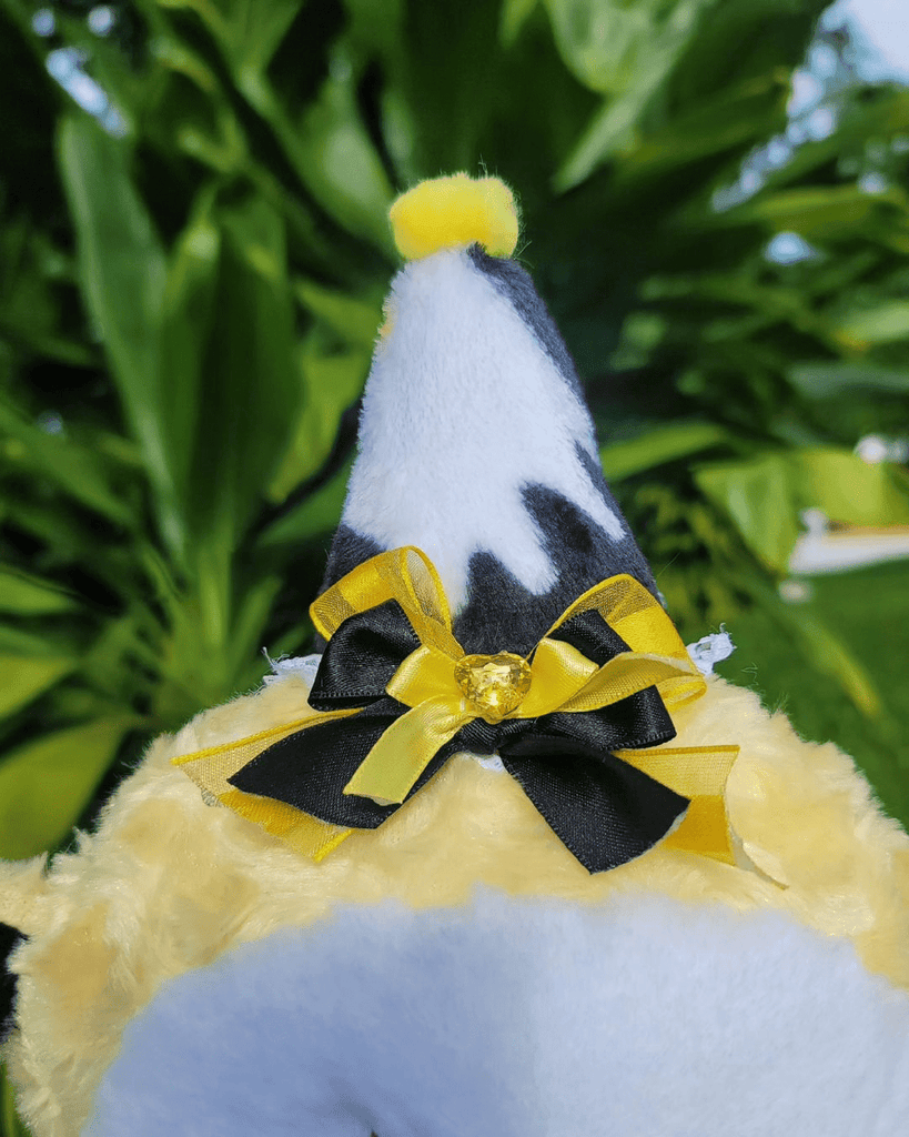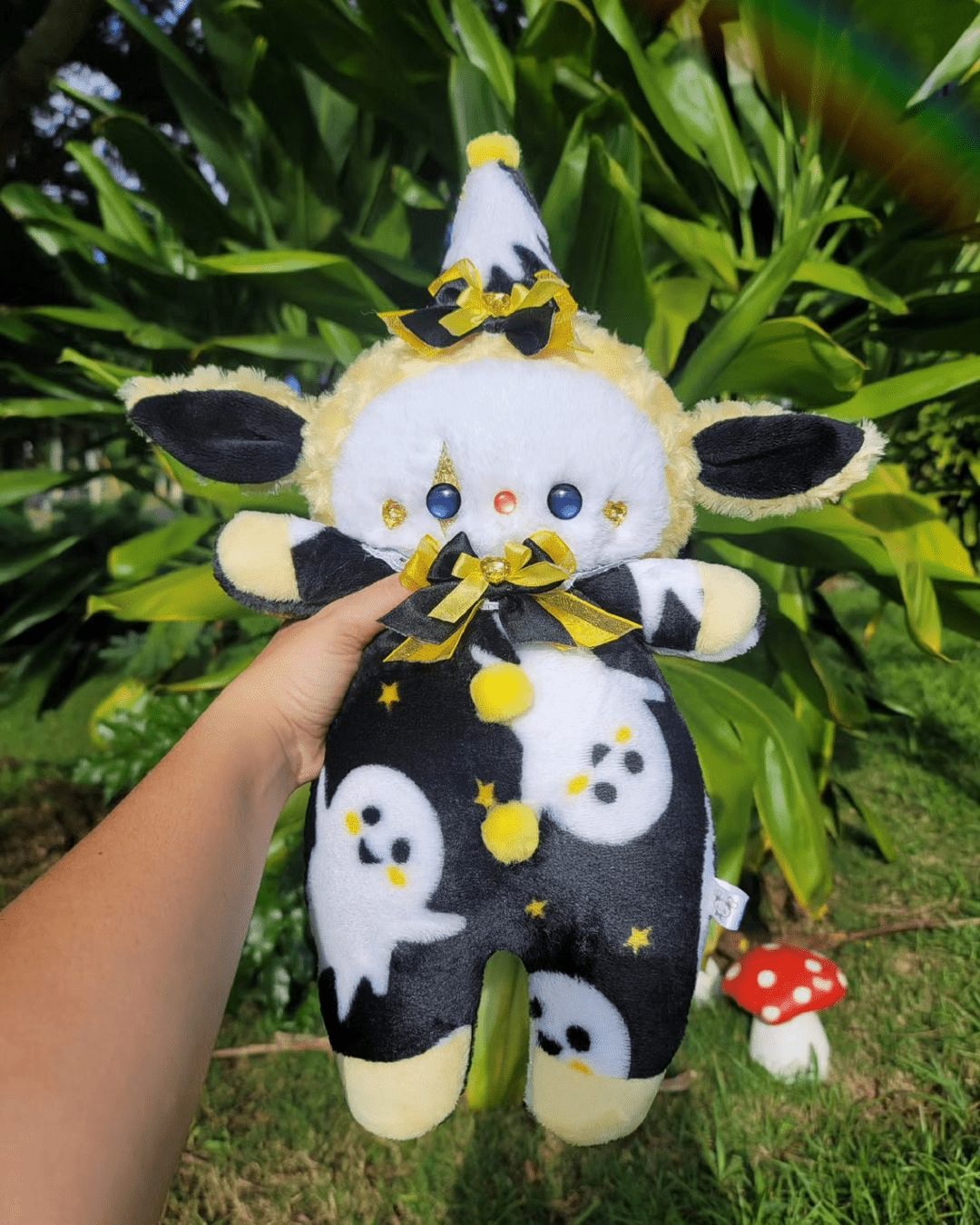 Meet this little Clown Sheep Plushie! 💛🖤 He has lots of ghost friends and he loves playing in the other dimension. 💕 He can transform into a ghost and fly between the walls! If you hear noises in the night, don't be scared! He's just playing with his little ghost friends! ^-^👻💛